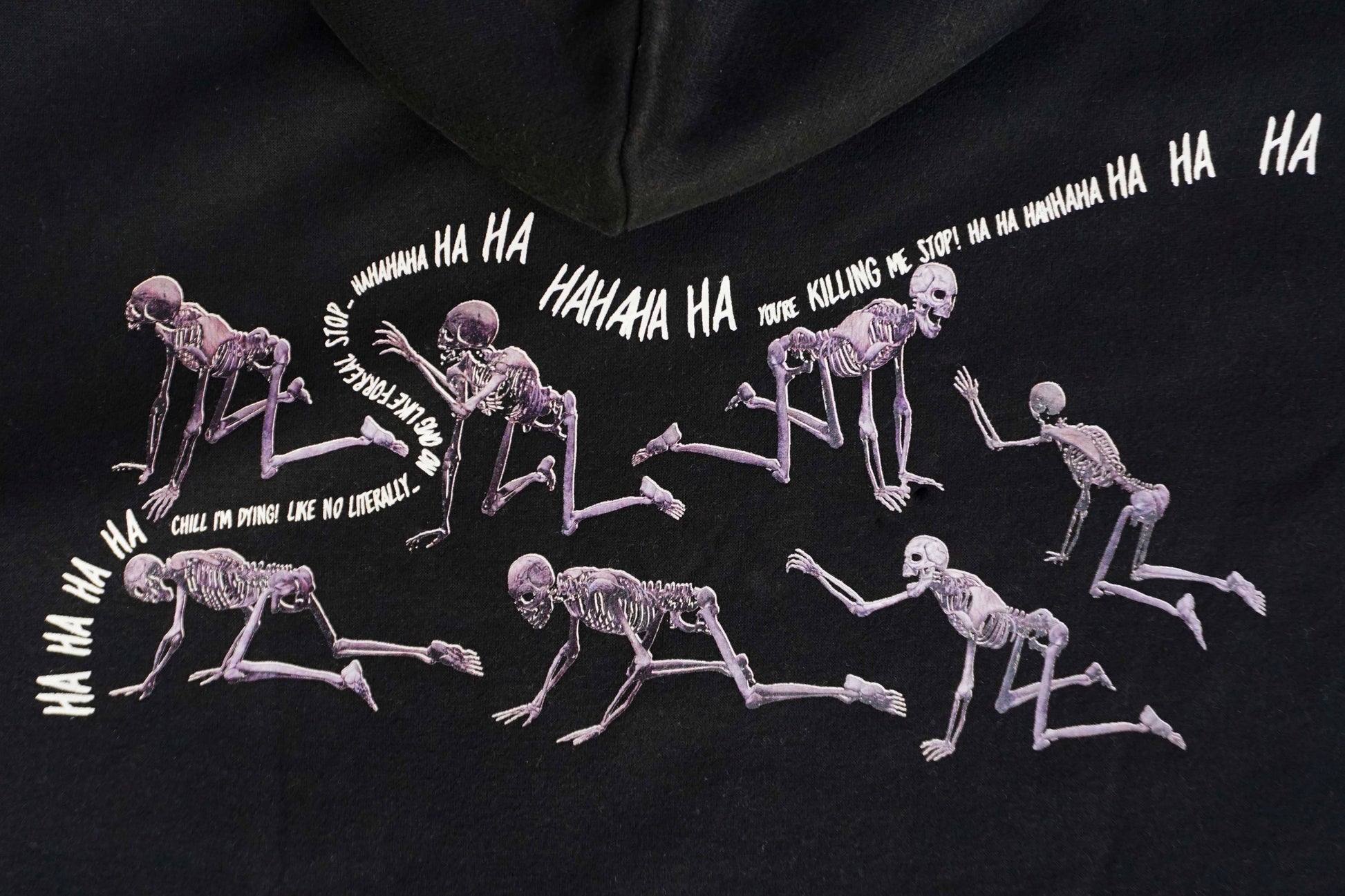 A black colored hoodie defined by the concept of the always smiling skeleton. No matter the look, mood, or personality of the person, the structure holding everything together is smiling. The same structure that holds and supports the weight of everyones creative spirits.