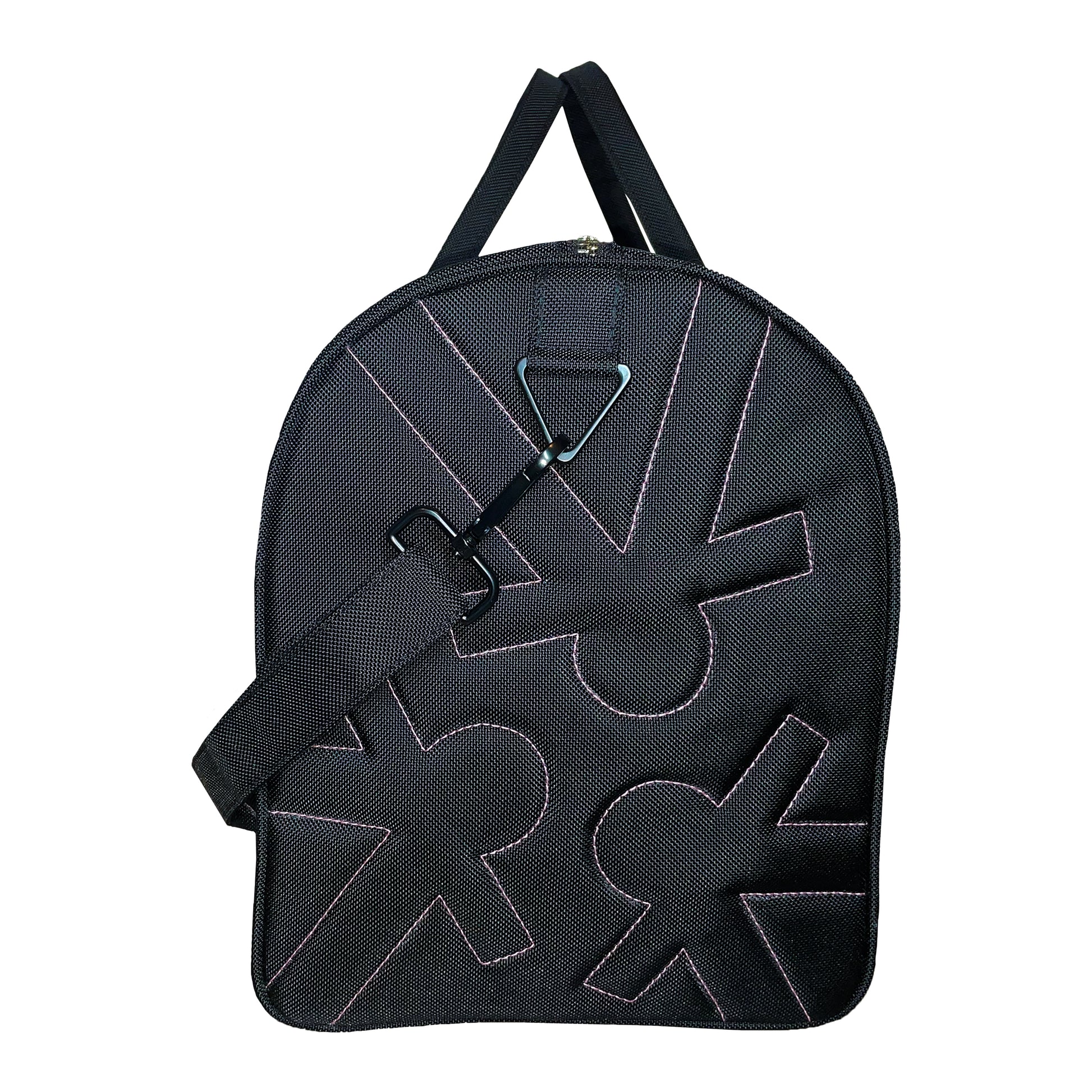 The outside shell is made of nylon with our signature triangle logo scattered around. The logos are stitched in a quilted style with WYOL pink thread. The inside of the bag is lined with a soft polyester and features two small pockets, one which can be zippered shut, for storing small items. All accessories of the bag are made of black cast iron. The bag also features an adjustable shoulder strap.